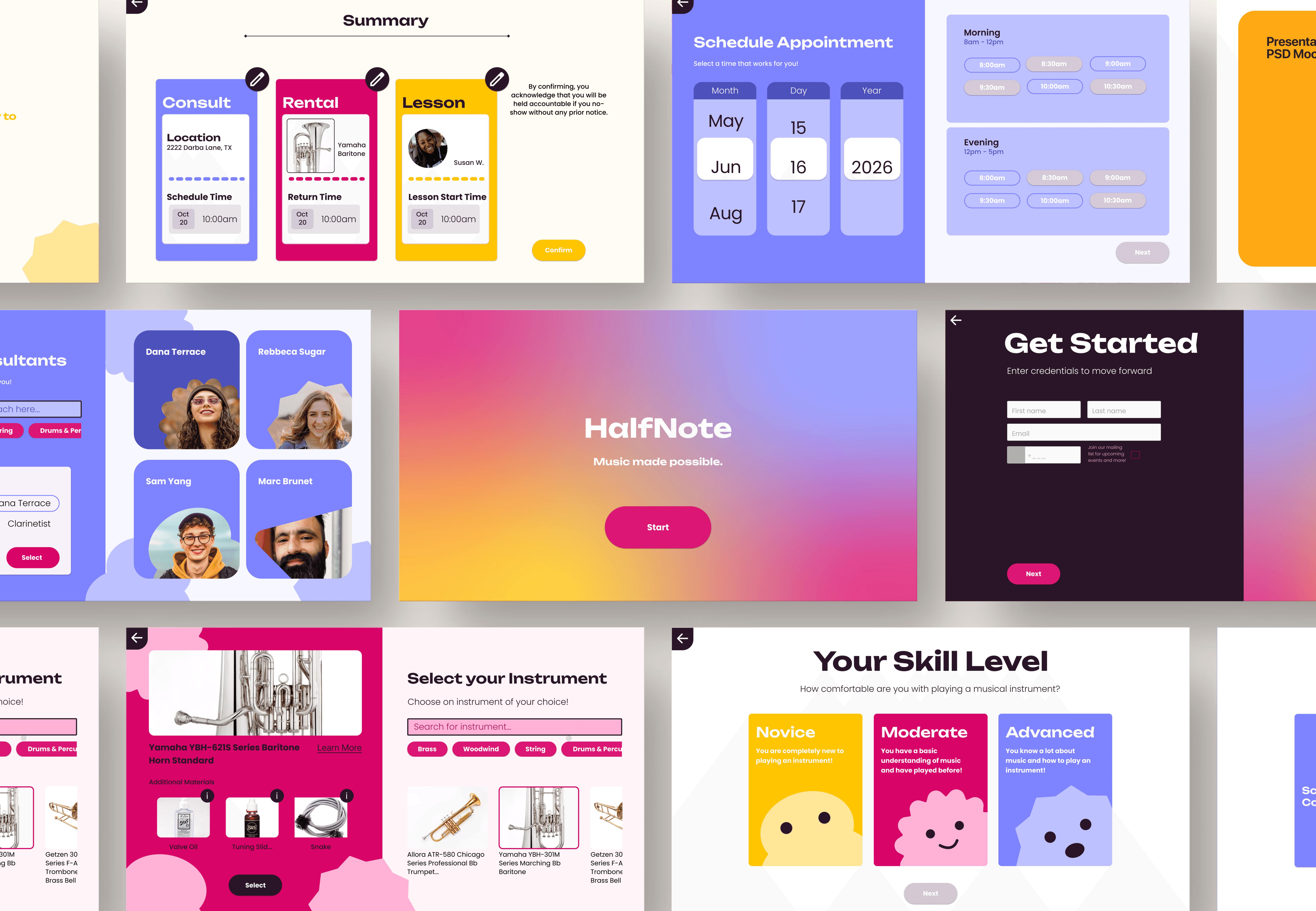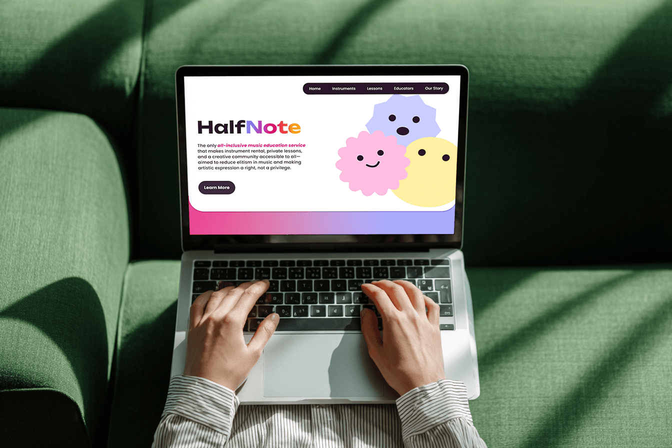 HalfNote is a group project that focuses on providing users of all ages with the ability to pursue a music education at anytime through our pop-up service. Enabling people to rent instruments, learn from professionals, and advance their understanding of music.
